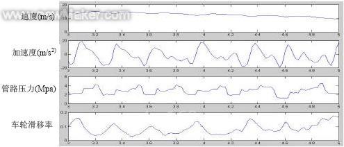 图9 为左前轮3~5s 的ABS 仿真试验数据,按照逻辑门限值的方式进行控制。从图9 中可以看出,在加速度为-20m/s2 附近,进行了快速减压,车轮的加速度增大,但车轮速度仍在减小。然后在加速度为-22m/s2 时出现了保压过程,此时滑移率为0.17 左右。紧接着是一个压力逐渐增加的过程,在这个过程中车轮的加速度逐步减小,但车轮速度继续增加,此时车轮滑移率控制在0.1 附近,接着又是一个短暂的保压过程,车轮的加速度增大,此后又开始了新的一轮的制动压力的调节。车轮的加速度在(-20~20)m/s2之间,管路压力在(1.5~4.5)MPa 之间。图10 为道路试验数据,比较两图,仿真数据与试验数据基本吻合。