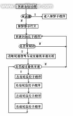 防抱控制系统的软件由防抱控制和安全保障两大部分组成。防抱控制部分的功能是对经过输入电路预处理后的车轮转速信号进行采样、计算和分析,并形成相应的控制指令;安全保障部分的功能是对系统的工作状态进行监测,在发现存在影响系统正常工作的故障时,发出警示,并将系统自动关闭。另外还具有一定的容错和抗干扰的能力。