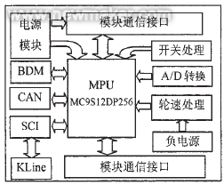 MCU是ABS/ASR集成控制系统的核心,它负责数据的采集和处理、所有的逻辑运算以及最终控制的实现。考虑到集成控制系统对其运算能力、存储空间、I/O接口的要求以及后续集成其它系统的目的,选择了功能强大的Motorola新一代HSC12系列16位MCU——MC9S12DP256。