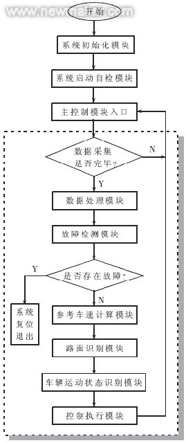 集成控制系统的控制软件主要由系统初始化模块、启动自检模块、主控制模块、制动踏板中断服务程序模块等几大部分组成,总体框图如图4所示。
