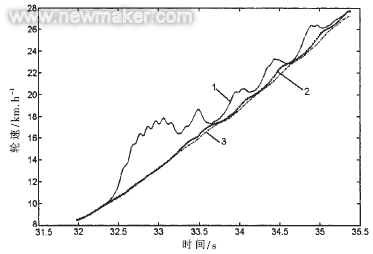 ASR试验选择一挡对开路面起步过程,右侧车轮位于低附着系数路面上。图6为起步过程中左右两侧驱动轮转速对比,其中曲线1为右侧驱动轮车速,曲线3为左侧驱动轮车速,曲线2为非驱动轮车速,可近似认为是车身速度。可以看到起步初期,右侧驱动轮发生明显的滑转,在33.5秒附近ASR开始调节,车轮的滑转明显改善。图7为起步过程中左右两侧驱动轮滑转率的变化曲线,更明显地反映出进行ASR控制后,右侧滑转驱动轮的滑转率被控制在较为理想的范围内。同时,由于制动干预的影响,左侧驱动轮的滑转率略有上升。