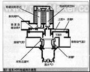 ABS电磁阀的具体控制过程(图3)为:从紧急继动阀过来的制动信号气从4口进入系统,然后经电磁阀阀芯M1和M2到达活塞上腔A,推动活塞下移,封闭活塞下腔B和大气的连接,继续下移则推动环形活塞RK下移,从而使储气筒的气源可以通过1口进入B腔,到达出气口2,进而到达制动气室。