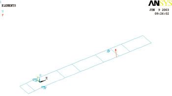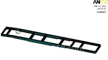 在ANSYS中用BEAM188单元实施网格剖分时,为了保证单元的正确方向,应事先定义该单元的方向点并检查所要剖分的线的法向。单元截面形状和偏置量需用命令SECTYPE、SECOFFSET和SECDATA设定。单元总数为312,节点总数为626。网格剖分并映射后车架模型如图1所示。图中显示出了梁单元的截面形状。