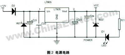 汽车蓄电池提供12V左右的电源,而该仪表板需要两路电源:+5V和+12电源。5V电源用于给MB90F428、CAN接口芯片(PCA82C250)和EEPROM等供电,12V电源给LED、蜂鸣器等供电。考虑到成本和易购性,我们选用7805芯片作为电源转换芯片。为了在掉电的时候可以及时地保存里程数据,在电源地输入端加一个1000 F的电解电容,当电源断开的时候,大电容可以维持单片机电源足够长的时间,使得单片机可以完成外部中断的服务程序。如图 2 所示。