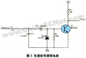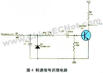 汽车车速传感器和发动机转速传感器通常采用霍尔器件。当车轮开始旋转时,霍尔效应传感器开始产生一连串脉冲信号,脉冲的个数将随着车速增加而增加,但位置的占空比在任何速度下保持恒定不变。为了改善波形,在输入捕获定时器管脚外添加调理电路,对脉冲信号进行整形放大,这里我们通过RC滤波和三级管放大的方法处理。如图3、图4所示。