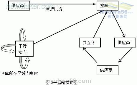 依据这种运输系统总体构想,分别以整车厂为中心,对各零部件供应商与其所在的位置进行测算,规定在一定范围的公里数以内采用直达运输方式。超过规定公里数的以MILKRUN运输方式为主,这种方式适合批量小,送货频率高的零部件,对于大宗的零部件应考虑设立若干个零部件配送中心或中转仓库,如下图所示。