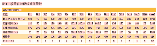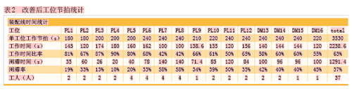 经过为期两个月的改造,生产线平衡较改进前有较大提高,编成效率由51%上升至92%,最长工序时间由480s降至240s,单车总装配时间由3990s下降至3530s,线速提高了一倍,在设备正常的情况下可以完成8h单班产量120。