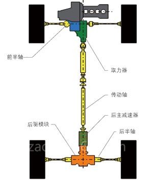 图4是取力器在汽车动力总成的位置示意图。从车辆后面看过去,左边的传动半轴直接连入变速箱边齿轮,右边的传动半轴连接到取力器中间轴外花键。