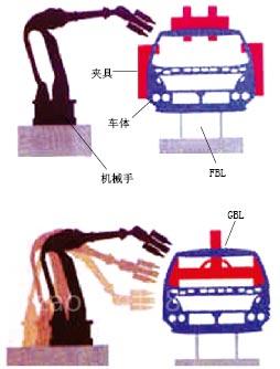 在汽车制造企业的流水线上,最核心的生产流水线是车身生产流水线,其中关键工段是车身焊接。将各个车身部件焊接在一起,必须有夹具固定部件位置。夹具是非常重要的辅助工具,它的合理性不但影响加工位置的精确性、焊接质量,也影响到工作效率和生产成本。丰田的GBL设计者就从这里进行了革新。以前的FBL要利用三套昂贵且高精度的夹具(如图中红色),它们从外面固定住加工车身,从车体的左、右和上方等三个位置将车体固定住,然后由机械手臂或者人工对车身进行焊接。这些托架与车身一起移动,直到完工为止。当一辆轿车车体上线时,传送机械从头顶上方的储放区运来三个一组的夹具,将它们运送到车身组装线的位置。如果顺序生产的下一部车是不同的车型,那么该系统将取来另外一组夹具,并将它们运送到组装线上。