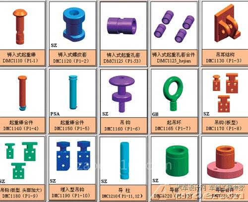 通过分析模具的结构特征,参数化模块技术将模具划分为端头、工作部件和基础件等,并建立常用模具模块参数化设计数据库,如模具的端头(图1)、气缸顶料合件、托料装置等,其中端头可以在一定形状尺寸范围内通用,同时针对模具中使用的标准件,设计开发一套完整的三维参数化标准件库(图2),与UG的集成环境有机结合,采用界面简捷、直观的图形化菜单,操作方便,具有良好的人机交互性、可扩充性和可移植性。在标准件的建立过程中,通过知识驱动表达式,不但能改变标准件的规格,而且可改变其特征类型、增加或减少某些特征。在标准件中通过建立用于布尔操作的实体,从而实现了在装配中与其他非标零件进行加减的操作,加快了模具结构实体设计的速度。
