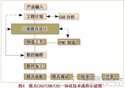 图4所示为模具CAD/CAM/CAE一体化技术流程。由该流程图可以看出,整个CAD/CAM/CAE过程以3D模型为中心,模具设计、有限元模拟分析、模具CNC加工以及模具CMM(三坐标)检测都完全基于这些3D模型的传递,从而避免了二维图纸传递几何信息的不准确性,使最终生产的零件和设计者的意图保持高度一致。