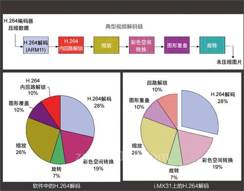 该图显示了为解码和显示采用H.264标准压缩的视频流而必须执行的不同任务。除了解码 H.264数据流,还必须对由此得到的视频进行大小调整、旋转,从YUV格式转换到RGB格式,并用 HMI图形重叠。左侧的饼形图显示了如果这类任务均在软件中执行时CPU负载的百分比。我们可以看到,H.264解码和H.264内回路解锁功能只占用38%的