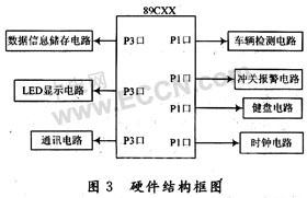 其硬件电路是以Atmel公司生产的89CXX系列单片机为核心器件,使用了多种功能的新型接口芯片扩展接口电路。接口电路包括车辆检测电路、冲关报警电路、数据信息储存电路、车辆计数显示电路、时钟电路、键盘电路、通信电路等。其硬件结构框图如图3所示。
