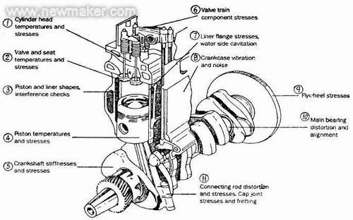 目前,新发动机开发需要进行的 FEA 分析对象主要有:气缸盖、机体、气缸套、曲轴、活塞、连杆、排气管、增压器支架等。