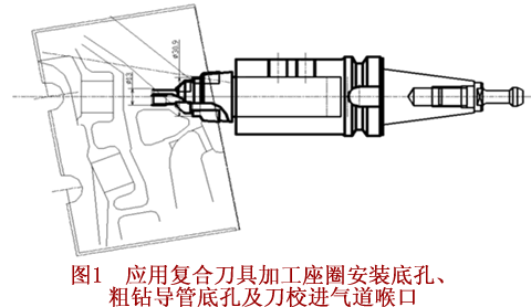 1、采用复合刀具一次完成进气座圈安装底孔、粗钻导管底孔φ10.5mm及刀校进气道喉口的粗加工(图1)。