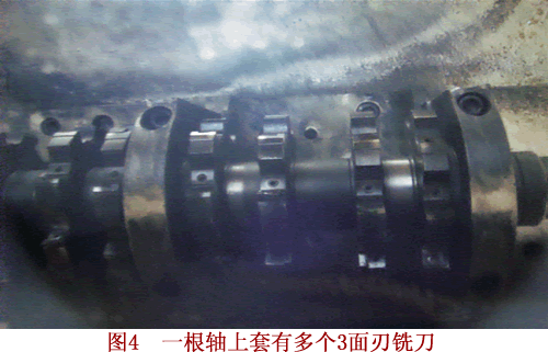 在加工主轴承档的两个侧面时,采用的是复合加工刀具,即将多片3面刃铣刀安装在机床刀具主轴上,可以在一次进给中,完成多档主轴承孔两个侧平面的加工(图4)。