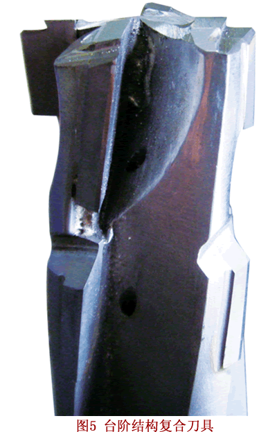 在粗加工缸盖16—φ30.4mm挺杆孔时,由于毛坯单边余量大于4mm,原设计方案是在一次走刀中完成全部切削加工,但刀具会承受较大的切削抗力,容易出现闷车、损坏刀具和拉坏工件加工表面。如果采用两次加工,又将增加换刀工序,使机床加工节拍难以保证。综合考虑后,最终采用台阶结构的复合刀具(图5),将切削余量分配在前后刀齿上,从而满足了工艺要求。
