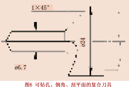 复合加工技术的应用也常受加工条件、刀具寿命、刀具制造工艺性、零件结构的限制。如对于钻孔、倒角、刮平面这一套工序,如果采用复合刀具(图6),不仅刀具结构复杂,而且工艺上也不合理。钻孔先接触的是工件毛坯面,由于钻削时钻头两侧切削刃切削力不相等,容易造成钻头偏斜,同时刮平面刀具直径与钻头直径相差太大,易造成加工过程中钻头和刮刀连接处折断。