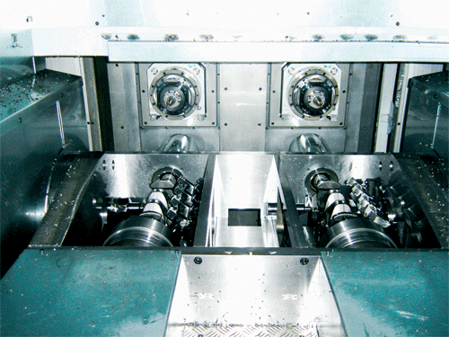 HPC FLEX-V200双主轴加工中心上,带回转的工作台上备有2套夹紧装置。左右两个工件分别由左右两根主轴进行加工,加工过程同步进行,只需一套控制系统。工件无需进行预加工或者仅部分预加工,在传统的生产线上完成基本加工工序后,传送到HPC FLEX-V200的旋转工作台上,自动调整加工位置后即可同时完成工件左端面和右端面的加工,生产效率可提高1倍。