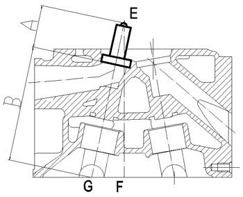 从图中可以看出,C为进气座圈安装面深度,加工要求103.19±0.05mm;B为排气座圈安装面深度,加工要求104.39±0.05mm。这些加工参数都是孔中心与顶面交线的距离,此距离的变化将影响气门座圈的轴向位置。