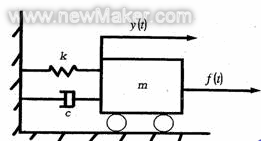 于是可将其进一步简化为质量-阻尼-弹簧系统,如图2所示,图2中m、c、k分别表示质量、粘性阻尼系数、弹簧刚度。对系统而言,质量受外力f(t)的作用,质量位移为y(t)(实际扬声器衔铁的振幅),系统的动力学方程为my"(t)+cy'(t)+ky(t)=f(t),y(o)=yo,y'(o)=y'。