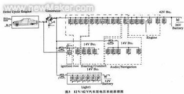 如先前所提及的,安全性和舒适性的需求导致了新的、高能耗的负载。这些负载可能随着汽车产品的进一步电子化,汽车电子控制装置得到更多的应用,所消耗的电能也将大幅度地增加。现有的12V动力电源已满足不了汽车上所有电气系统的需要,今后将采用集成的42V起动机-发电机供电系统,发电机最大输出功率将由目前的1.4kW提高到8kw左右,发电效率将会达到80%以上。伺时,电压等级的提升还将同时带来许多新的问题。12V/42V汽车双电压系统原理图如图3所示。