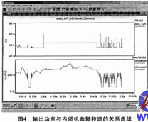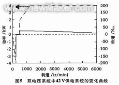 大功率起动机与发电机(Integrated Starter/Alternator,ISA)的转矩特性一致,因此,集成两种设备于一体在技术上是可行的,在经济上的效益也显而易见。如图4所示的输出功率与内燃机曲轴转速的关系曲线,ISA让内燃机的速度达到600v/min的起动速度,然后切换到发电模式。由于42V系统能够提供足够的电能,发动机在极短的时间内起动且 在点火前达到更高的转速,这样可以降低低转速下的排放,换句话说,使得汽车重起动变得更加容易。