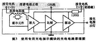 2.开发使用专用充电指示模块。此种模块通过内部取样电阻线检测发电机充电电流(也可以使用霍尔元件检测取样电阻线产生的磁场),经过放大、比较后驱动指示灯,原理框图见图3。此模块也可以集成到调节器内部,从而简化安装、提高可靠性。