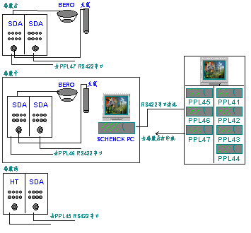 转毂测试分三步进行,转毂前,转毂中和转毂后。转毂前主要测试ABS电脑连接是否正常,及故障存储器的内容,若此处检测未通过,则不进行以下的两步检测,直接送返修。转毂中主要测试制动力和摩擦力,其中BERO是超声波传感器,检测是否有车驶入,这是启动检测的必要条件之一,定向天线从MDA中读取MDA号码和车号,接下来的通讯工作由右侧的SDA与车内的MDA完成,检测过程中,检测站PPL和第三厂家的PC通过RS422接口通讯,检测站向第三厂家PC发命令,让转毂按一定速度转动,并且从第三厂家PC中读回各种转毂状态。转毂后主要作LEP检测,BERO和天线的作用同转毂中。