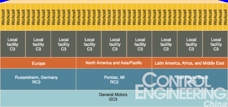在技术服务供应商EDS的帮助下,GM的系统集线器就是位于MI Pontiac的通用汽车全球命令和控制中心(GC3)。从那里,高速数据连接延伸至区域命令和控制中心(RC3),这些区域命令和控制中心在战略上是服务于当地工厂的。