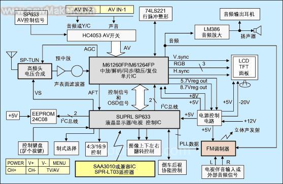 SP633是专为小尺寸车载或便携式液晶显示器/电视开发的多功能MCU控制芯片(已做了掩膜)。基于SP633的小尺寸液晶电视设计方框图如图1所示,主芯片为MCU SP633以及单芯片电视解码器M61260FP/M61266FP。