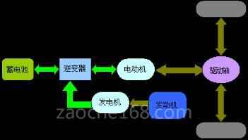 该结构的能量传递路径是把发动机生成的热能转化为电能,利用电能作为驱动力,其主要特点有:发动机不直接与动力传动系统相连,可保持在高效率区稳定工作;电动机随负荷的变化调速转矩和转速输出;电动机所需电能直接来源于发电机或蓄电池。由于发动机的工作区域稳定,所以排放性能好、能量效率较高。不足之处是系统的负载能力完全取决于电动机额定功率的大小,而且电动机的转速不能太低或太高,否则效率很低。串联式混合动力电动汽车主要由发动机、发电机、驱动电机和蓄电池组等部件组成。发动机仅仅用于发电,发电机所发出的电能供给电动机,电动机驱动汽车行驶。发电机发出的部分电能向电池充电,来延长混合动力电动汽车的行驶里程。另外电池还可以单独向电动机提供电能来驱动电动汽车,使混合动力电动汽车在零污染状态下行驶。