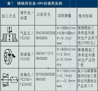 切削速度在1000m/min的高速精加工条件下,BNS800、BN600的刀具寿命是陶瓷刀具的几十倍,很适合于10mm级的高精度加工。图2 铸铁用住友cBN的适用领域及推荐加工条件。