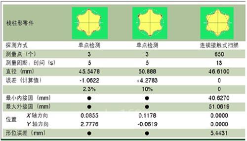 接触式探头既可以连续接触,也可以单点探测。连续接触式扫描探头会在探头和零件移动时跟踪表面的形状;单点探测则是单独对各数据点进行采集。本文表示为HEXAGON公司的测量实例,该表表明了连续接触式扫描和单点检测的优点,采集较多的数据能更完整、更精确地描述零件的尺寸。
