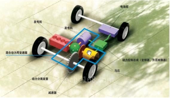 搭载了丰田独家的动力分离装置的混合动力用变速箱可以使高转速的发动机和大扭矩的马达所形成的两股动力相辅相成,产生协同增益效应。混合动力用变速箱由丰田公司特别研制的分离装置、发电机、马达、减速器等构成。发动机动力可由动力分离装置分成两部分,一部分送往车轮,一部分送往发电机。发动机的动力通过机械和电气两个途径进行传输。