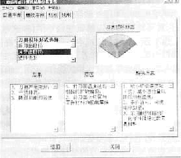 该模块是刀具损坏形式计算机辅助分析系统的核心部分,其主要功能是快速准确地查询刀具某一损坏形式的原因及对策。该模块采用人机对话方式,引导用户进行正确地选择,从而得到相应的解决方案。为方便用户应用,该模块还建立了帮助功能。数据查询模块的操作如图2 所示,如查询刀具在普通车削过程的“月牙洼磨损”问题,在加工方式tab控件中选择普通车削,然后,在数据窗口控件中选择“月牙洼磨损”,这时,在右边picture 控件中就会显示相应的刀具月牙洼磨损图像来验证选择的正确性,同时显示刀具产生月牙洼磨损带来的后果及月牙洼磨损产生的原因和具体解决方案(见图3)。解决方案包括合理选择刀具材料、切削参数,建议是否使用冷却液等。
