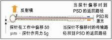 不同于传统的探针,传统探针必须越不易弯曲越好,而REVOTM探针则为弯曲设计,通常是在离探针端部约50微米处。这可偏转激光束的返回路径,光束将由同样安装在测头体内部的PSD(位置传感器)接收。