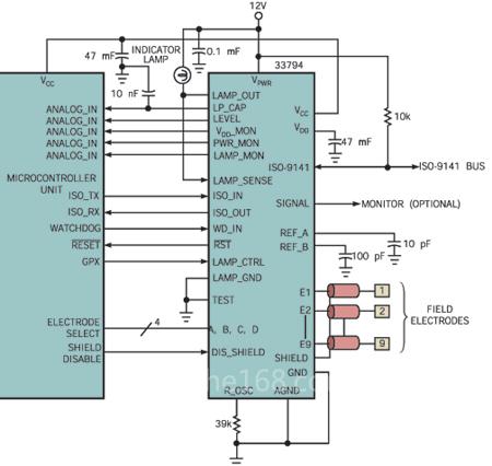 Freescale 公司的 MC33794 是此类电场传感器的核心(图 2)。它内部有一个 120kHz 振荡器,可将信号通过一个内部电阻器发送到传感器的各个电极。内部电阻器上的电压降是电极对地电容的函数。这种加在MC33794 的 9 个电极上的电容性负荷构成了被传感的电场。