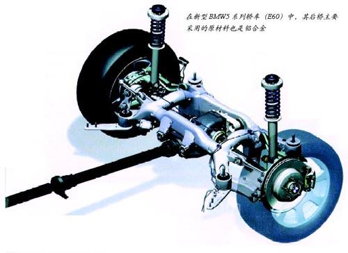 所有BMW汽车中均采用了轻合金结构底盘,例如,目前仍在生产的5系列轿车结构不断地使用铝合金材料,使其重量比老式5系列轿车的底盘减轻了大约50kg。同时,重量减轻后的汽车底盘仍然能满足所有的安全性能要求。