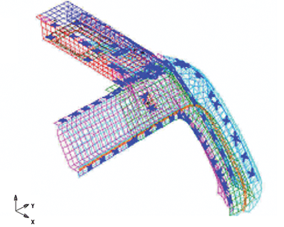 各个部件的网格划分完毕就可以开始连接焊点了。在车身中各个部件相互连接的部位,比如门槛前部、A柱等,焊接关系复杂,很容易漏焊或者多焊。已有的一些有限元前处理软件虽然可以通过手工操作完成连接焊点的任务,但是通常情况下,用手工连接焊点的方式需要一周的时间,而且即使在做了仔细检查之后,也很难避免焊点遗漏。相比而言,VPG不仅能快速完成网格划分,而且可以通过读入工艺部门提供的焊点文件在半天内完成整车的焊点连接,无一遗漏,保证焊点连接的准确性(见图2)。并且由于是根据焊点文件做的焊点,在工艺部门调整焊点位置时,工程师只需改动焊点文件相应的个别数据即可达到修改整车模型中焊点的目的。