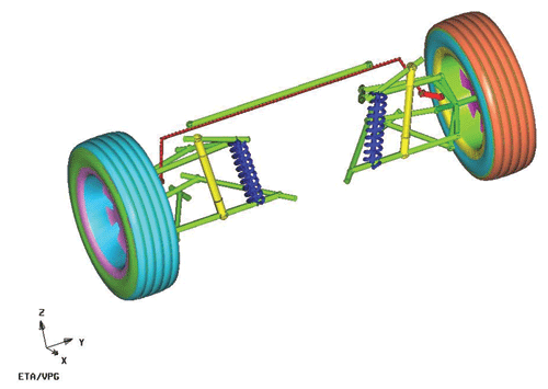 如果用户有悬挂的CAD模型,可以将其直接划分网格得到三维的有限元悬挂。VPG中自带10种前后悬挂可供用户选择(如图3)。如果通过VPG自动产生悬挂,用户需要简单进行悬挂硬点几何位置的调整,将VPG悬挂各个关键点的几何坐标调整为用户所分析悬挂的几何坐标,之后就可以让VPG悬挂和车身处于适当的相对位置,以便于悬挂和车身的连接。