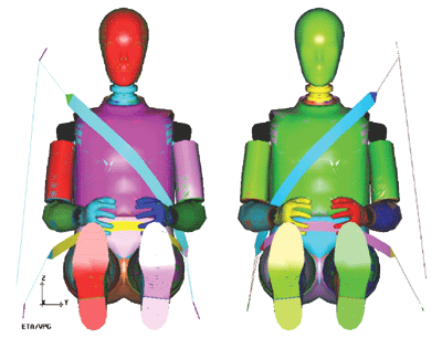 VPG/Safety整合了17种不同的FMVSS和ECE汽车安全法规,独到的“过程向导方法”使建立有限元模型效率更高,而且使复杂的仿真分析更加简单化,碰撞工具库中包括各种障碍物、假人模型、摆锤以及安全带等模型。