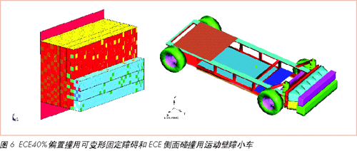 我国目前已发布的正面碰撞法规和2006年将要发布的侧面碰撞法规都是根据欧共体标准制订的。VPG内置了所有美国(FMVSS, Federal Motor Vehicle Safety Standards)和欧共体(ECE, Economic Commission for Europe Regulations) 被动安全性测试标准及其相应的测试工具。VPG用户可以免费使用其中的所有测试工具,包括正面40%偏置撞用可变形固定壁障和侧面碰撞用运动壁障小车(见图6),这就大大减少了用户建模的工作量,并且不必测试、调整壁障的各种性能,使用户可以快速建立完全适合法规的模拟环境。