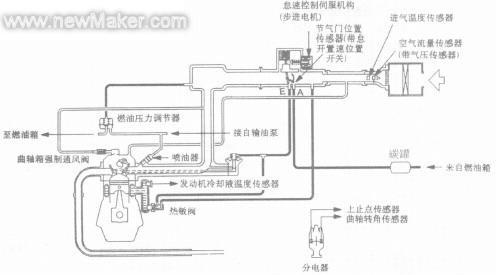多点燃油喷射系统包括检测发动机工况的传感器,发动机ECU 根据这些传感器发出信号控制该系统,各促动器在发动机ECU 的控制下工作,发动机ECU具有燃油喷射控制、怠速控制和点火正时控制等功能。