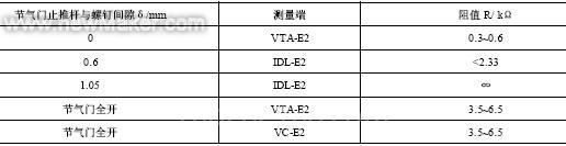 节气门位置传感器装在节气门室内,发动机进气量是由节气门的开度来决定的,该传感器用来检测节气门是关闭、部分开启或全开,VTA-E2 间的电阻值随节气门的开度从0.3~3.5-6.5Ω而变化。其端子间的电阻值变化如下表: