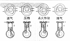 往复式发动机和转子发动机都依靠空燃混合气燃烧产生的膨胀压力以获得转动力。两种发动机的机构差异在于使用膨胀压力的方式。在往复式发动机中,产生在活塞顶部表面的膨胀压力向下推动活塞,机械力被传给连杆,带动曲轴转动。