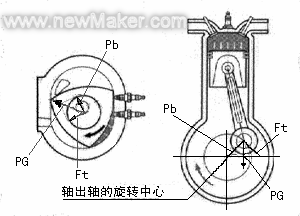 对于转子发动机,膨胀压力作用在转子的侧面。 从而将三角形转子的三个面之一推向偏心轴的中心(见图中力PG)。这一运动在两个分力的力作用下进行。一个是指向输出轴中心(见图中的Pb)的向心力,另一个是使输出轴转动的切线力(Ft)。