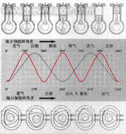 如图中所示,转子发动机工作容积的变化,以及与四循环往复式发动机的比较。尽管在这两种发动机中,工作室容积都成波浪形稳定变化,但二者之间存在着明显的不同。首先是每个过程的转动角度:往复式发动机转动180度,而转子发动机转动270度,是往复式发动机的1.5倍。换句话说,在往复式发动机中,曲轴(输出轴)在四个工作过程中转两圈(720度); 而在转子发动机中,偏心轴转三圈(1080度),转子转一圈。这样,转子发动机就能获得较长的过程时间,而且形成较小的扭矩波动,从而使运转平稳流畅。