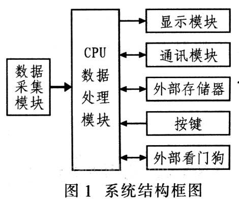 汽车动态称重仪主要由数据采集模块、数据处理模块、显示模块、数据通讯模块、外部存储器和外部看门狗组成,如图1所示。数据采集模块负责将称重传感器检测到的重量信号放大、滤波,转换成数字信号传送给CPU;CPU负责与各个外设的通讯和重量信号的分析和处理,并将处理完的重量信号发送给显示模块和通讯模块;显示模块负责重量信号的显示:通讯模块负责将重量信号发送到上位机;外部存储器存放仪表的参数:按键用来设置和修改仪表参数;外部看门狗用来提高仪表的抗干扰能力,增强仪表的稳定性。
