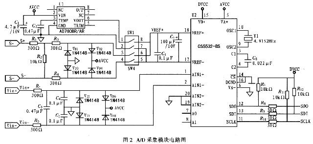 由于称重仪表需要高精度,采用外接A/D转换器,选用CS5532。该器件是美国Cirrus Logic公司推出的一种具有极低噪音的多通道型模拟/数字转换器,由于其采用电荷平衡技术和极低噪声的可编程增益斩波稳定测量放大器,内部集成了放大和滤波功能,可得到高达24位分辨率的输出结果,且具有高动态范围和灵活的电源配置选项等优点,使得该器件非常适合于动态称重。其基准电压由专门的基准电压器件AD780提供。电路如图2所示。
